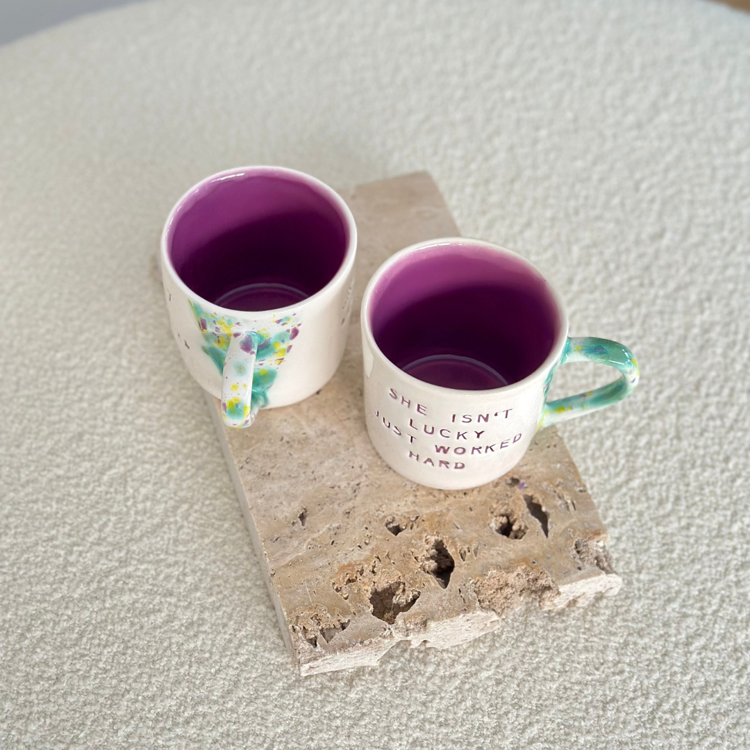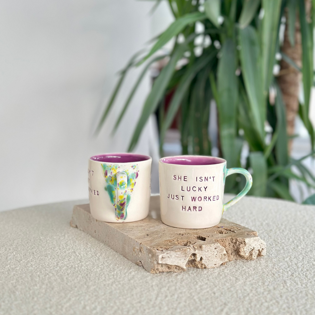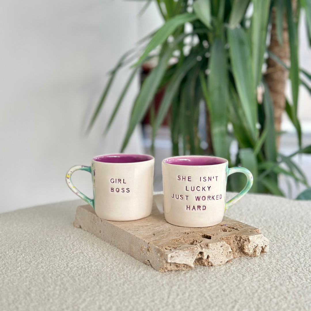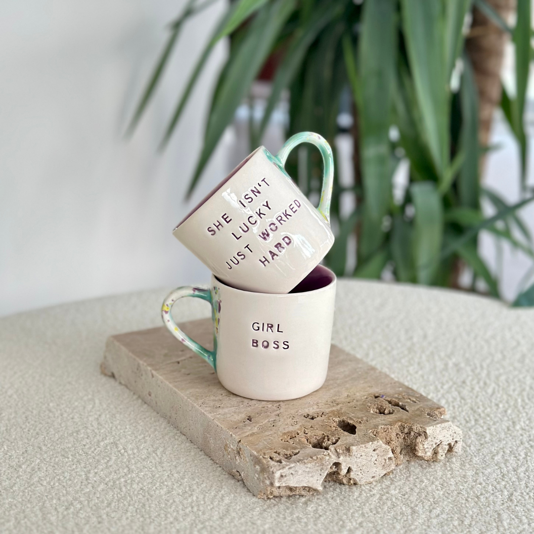 🌟Double-sided: On one side, we stamp the "Girl Boss" On the other side of the mug, we stamp the motto "She isn't lucky just worked hard". One item will be shipped.